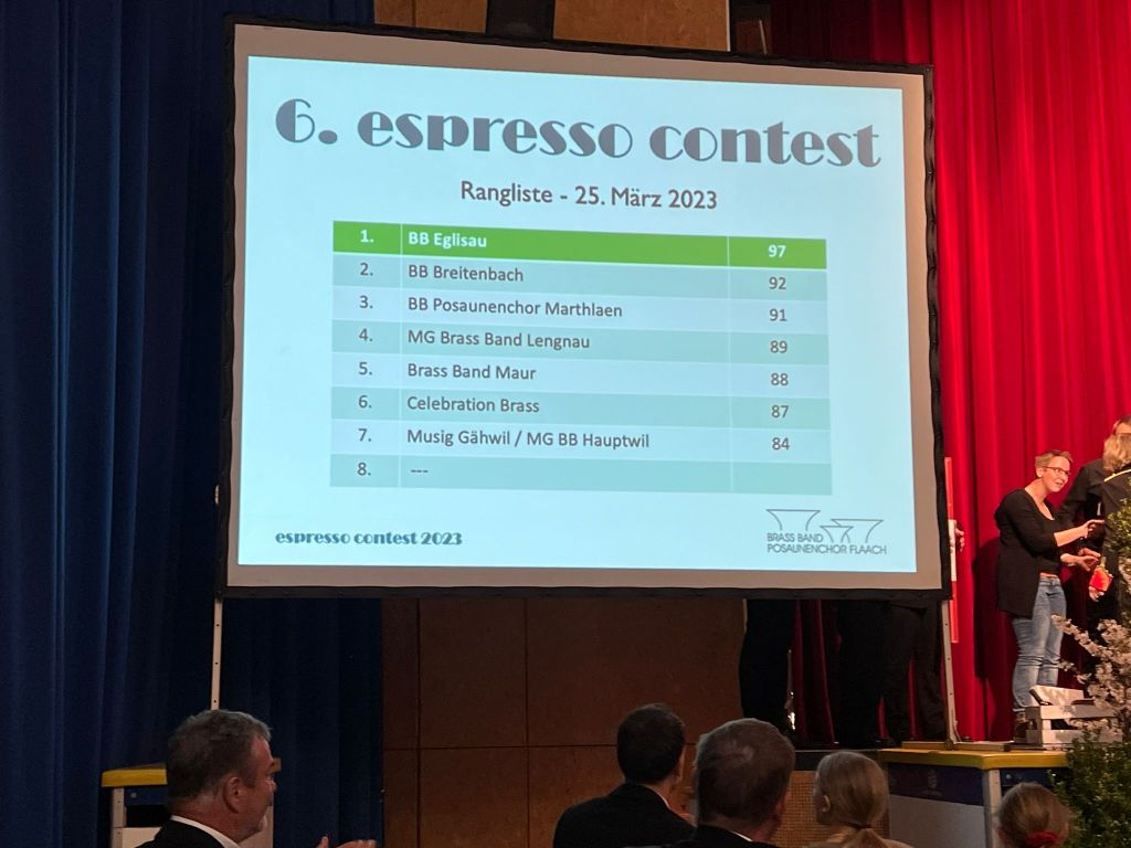 Wir freuen uns riesig, dass wir am diesjährigen Espresso-Contest in Flaach den 3. Rang erreicht haben! Als erste Band durften wir vor einem kleinen Publikum und zwei Juroren unsere eingeübten Musikstücke vortragen und bewerten lassen. Vielen Dank an unseren Dirigent Jürg Messmer (ad int.) für seine investierte Vorbereitung mit uns. Wir sind stolz auf dieses Ergebnis, nachdem wir an den letzten fünft Contests immer den 5. Rang oder 7. Rang belegt haben.